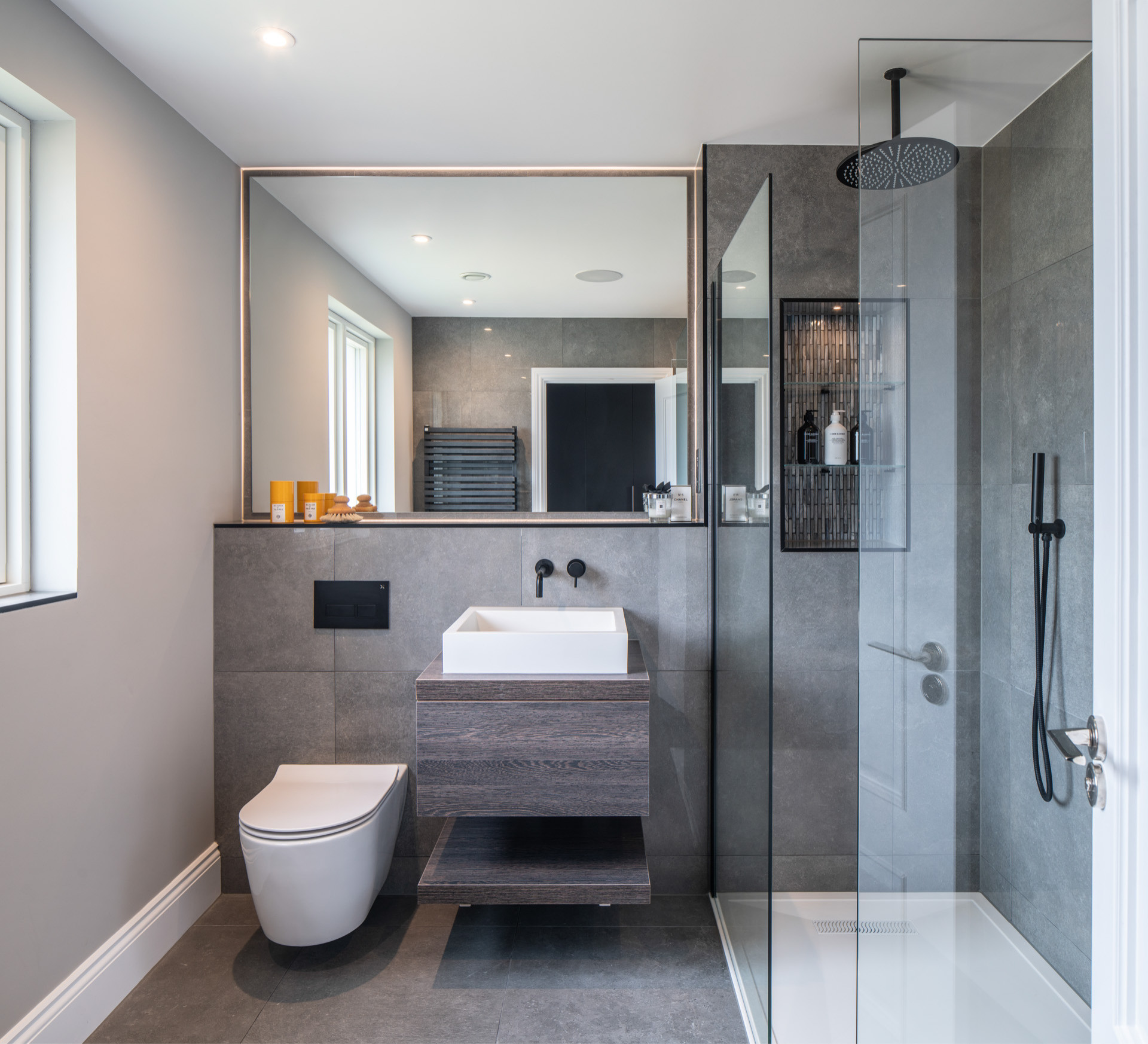 Grey kitchen cabinets oak worktop bathroom.